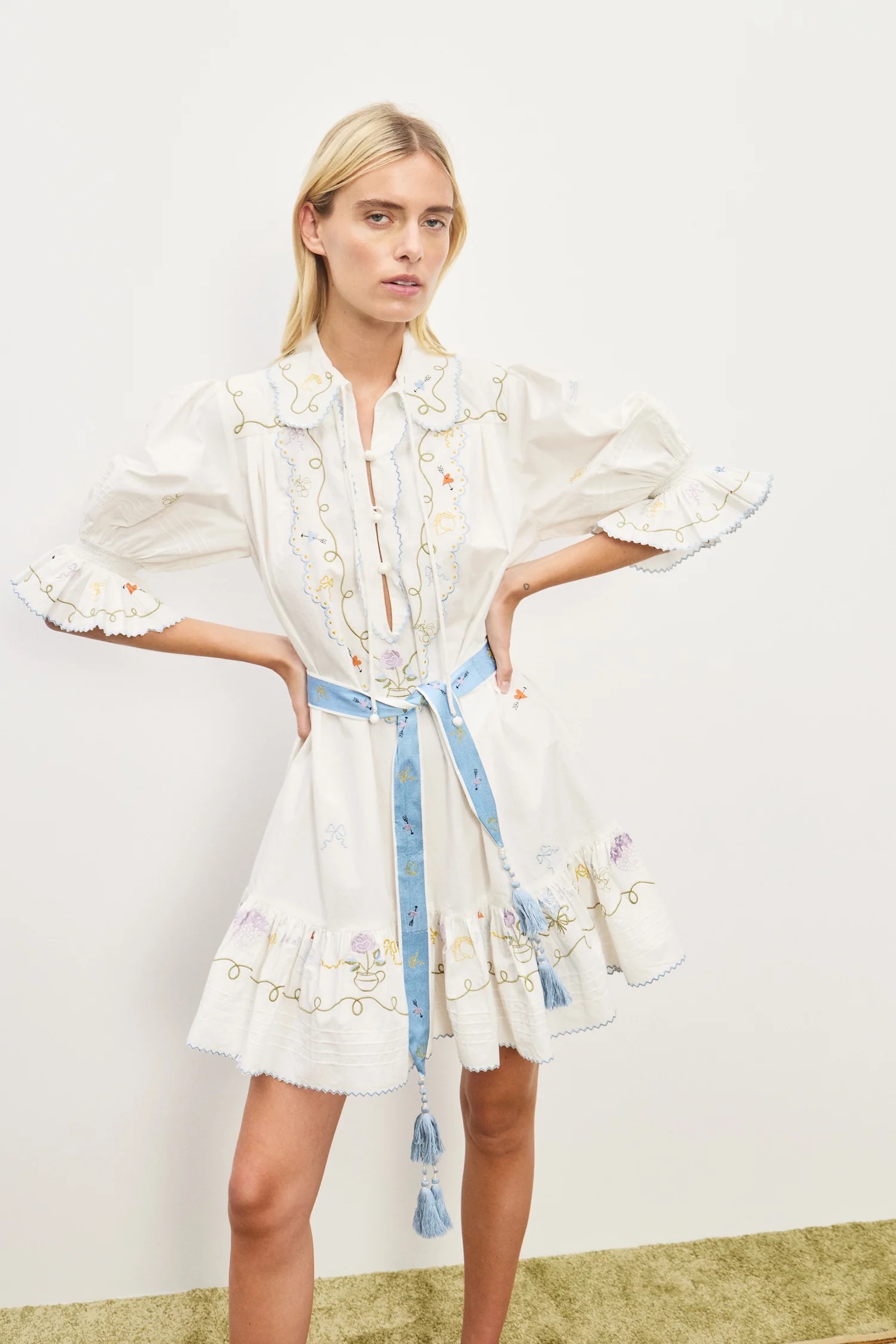 The Peter Pan collar and tie design awaken a sense of innocence. The voluminous silhouette of the puff sleeves paired with flared cuffs injects youthf