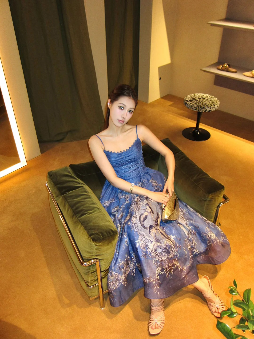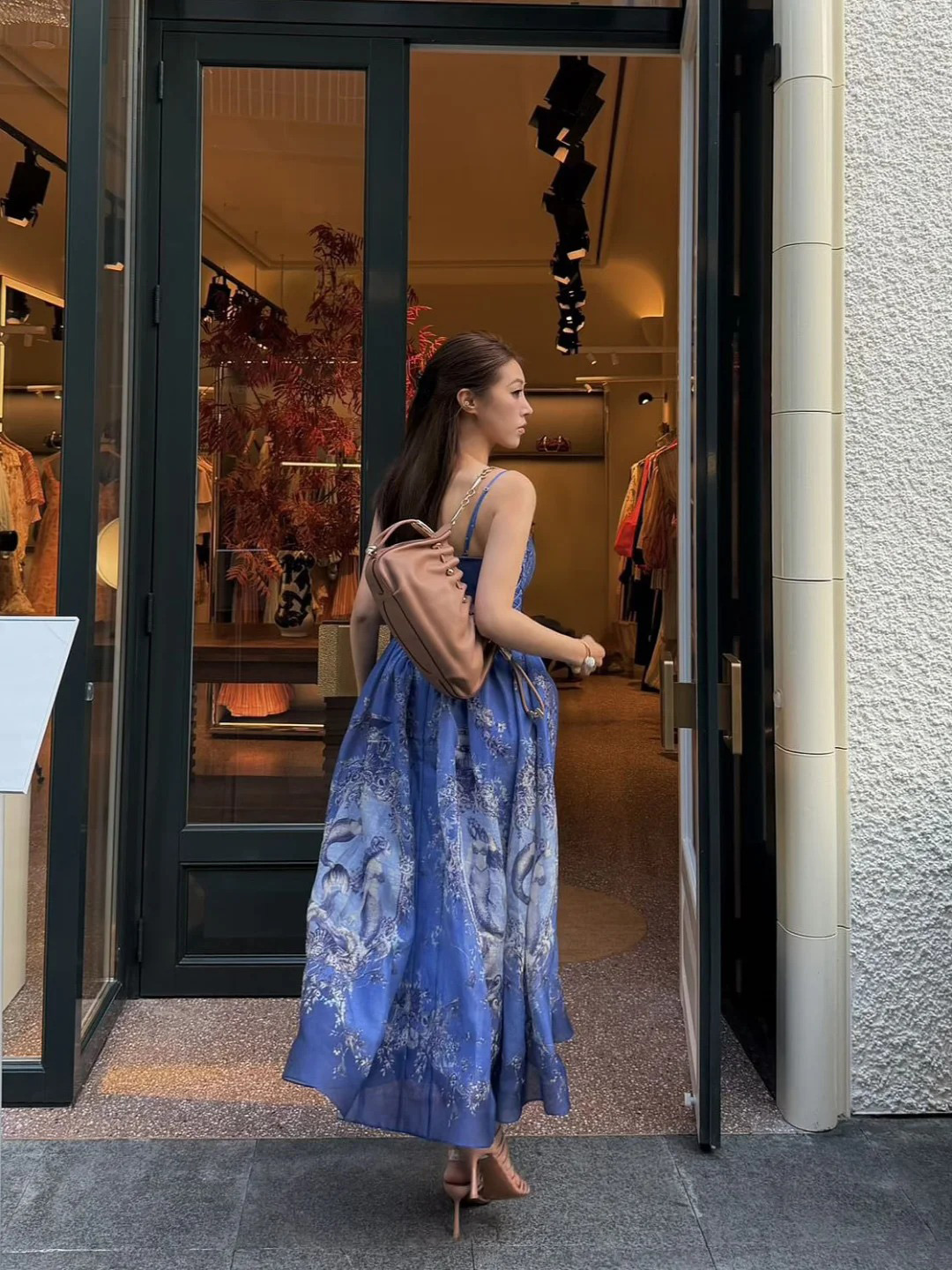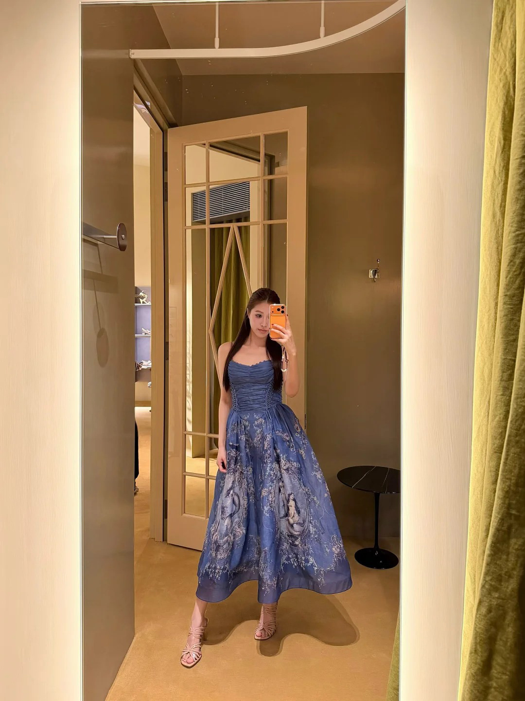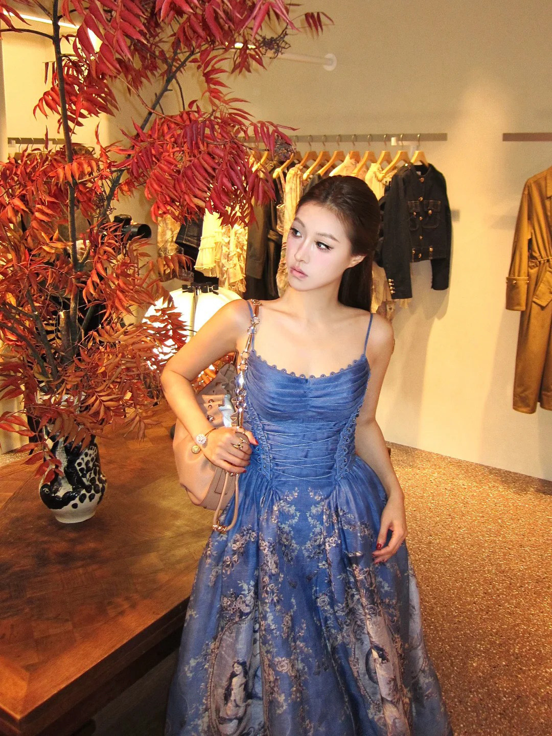 A stunning blue dress featuring intricate floral patterns.