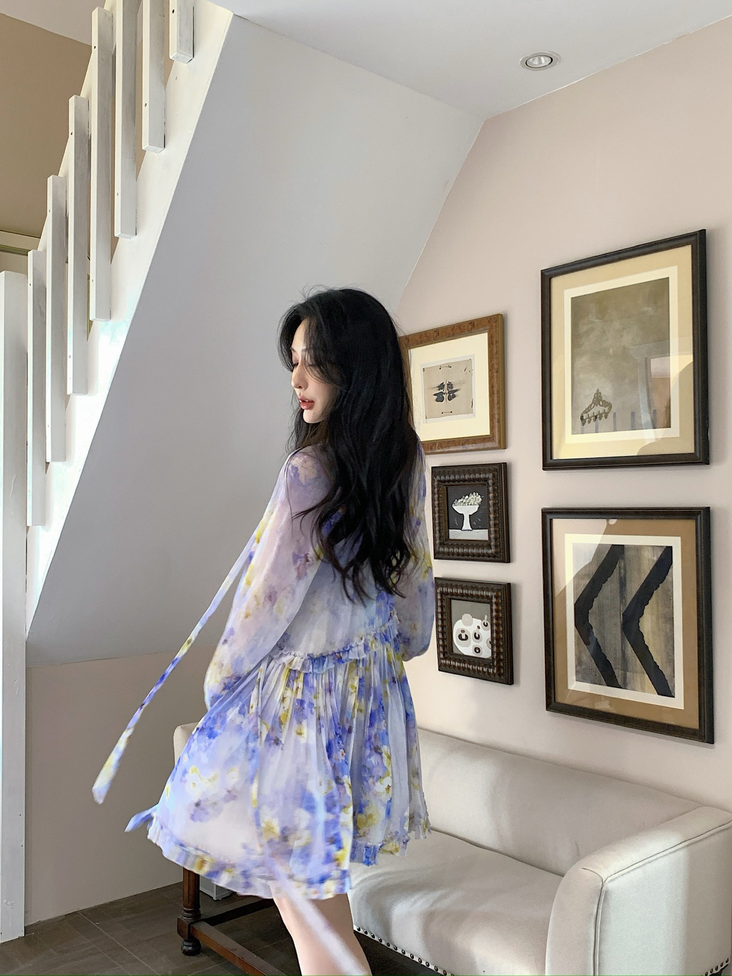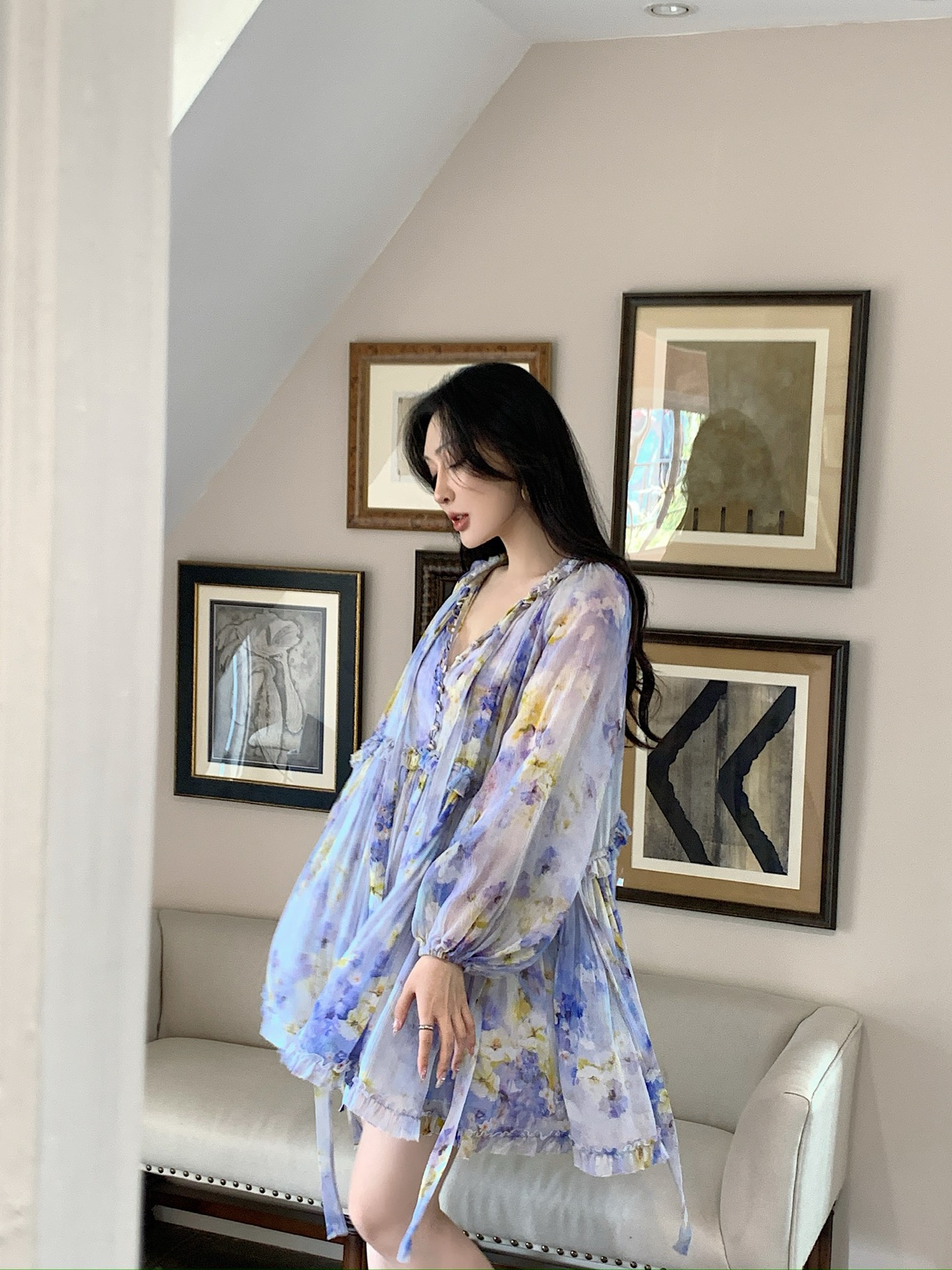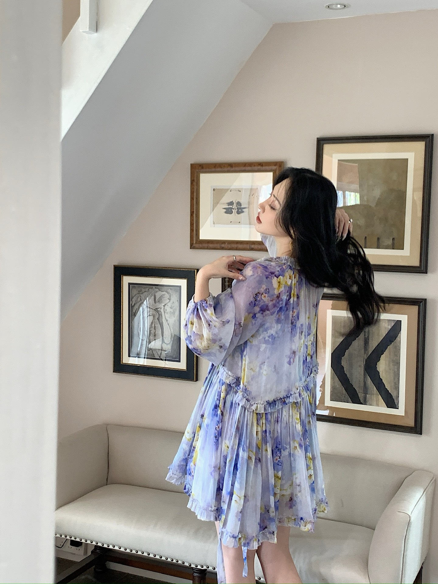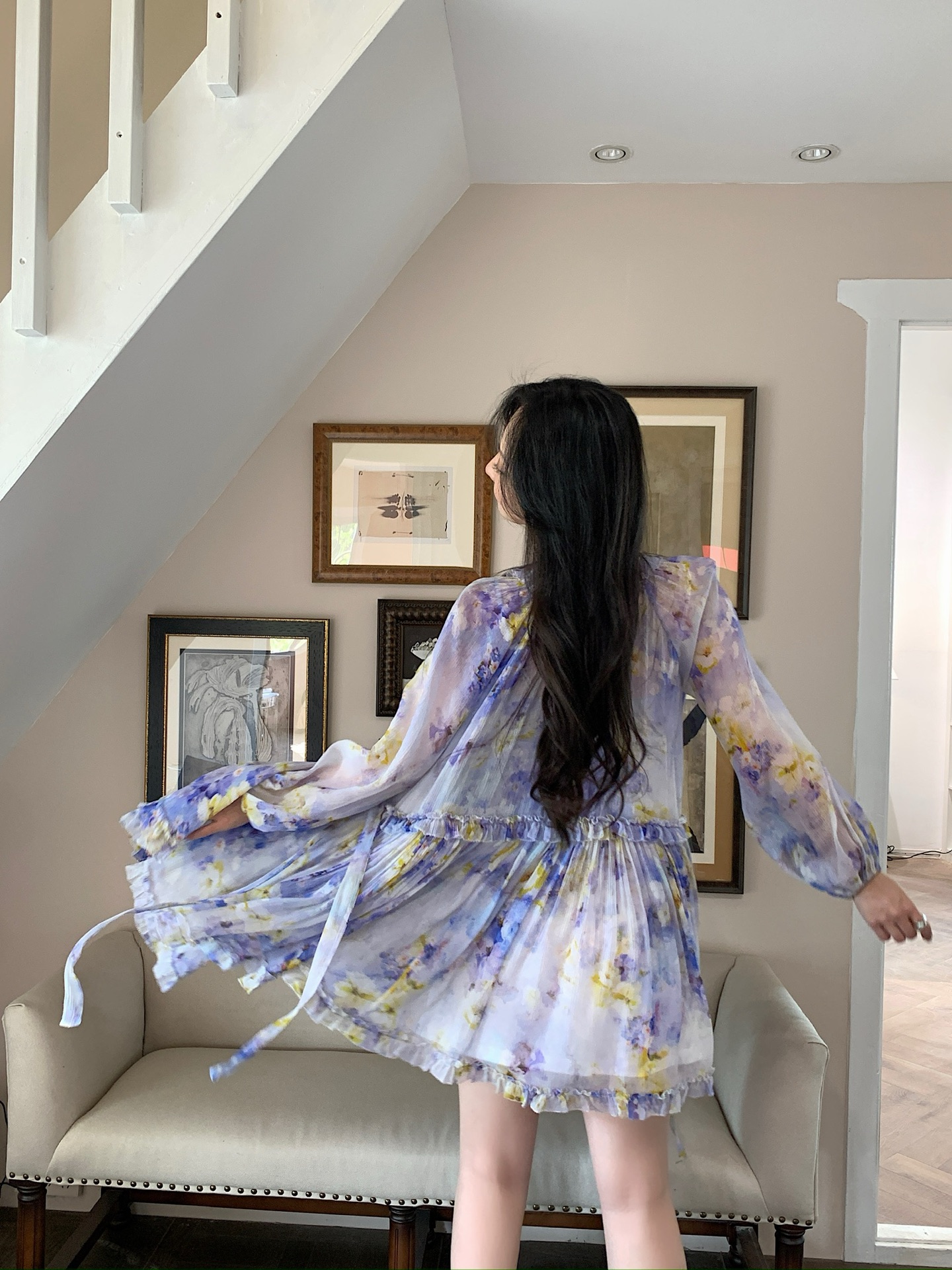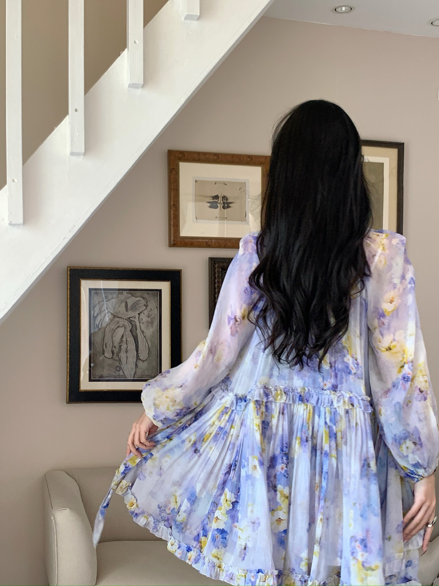 Misty purple flower shadows dye the chiffon, and the ruffled skirt crumples the tenderness of an entire Monet's garden.