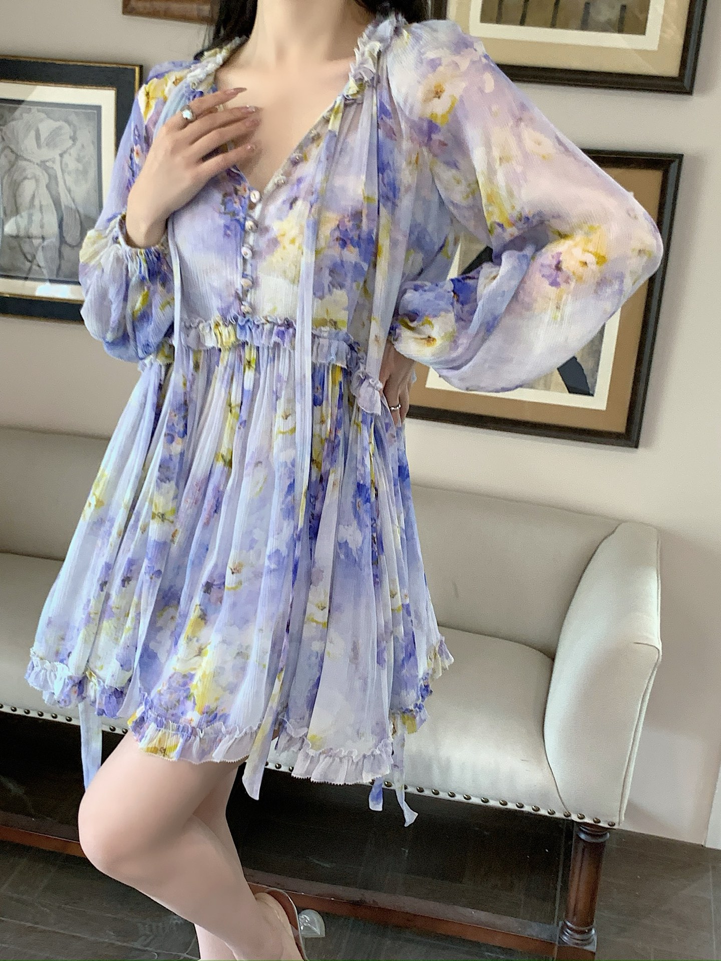 Zimmerman Misty purple flower shadows dye the chiffon, and the ruffled skirt crumples the tenderness of an entire Monet's garden.