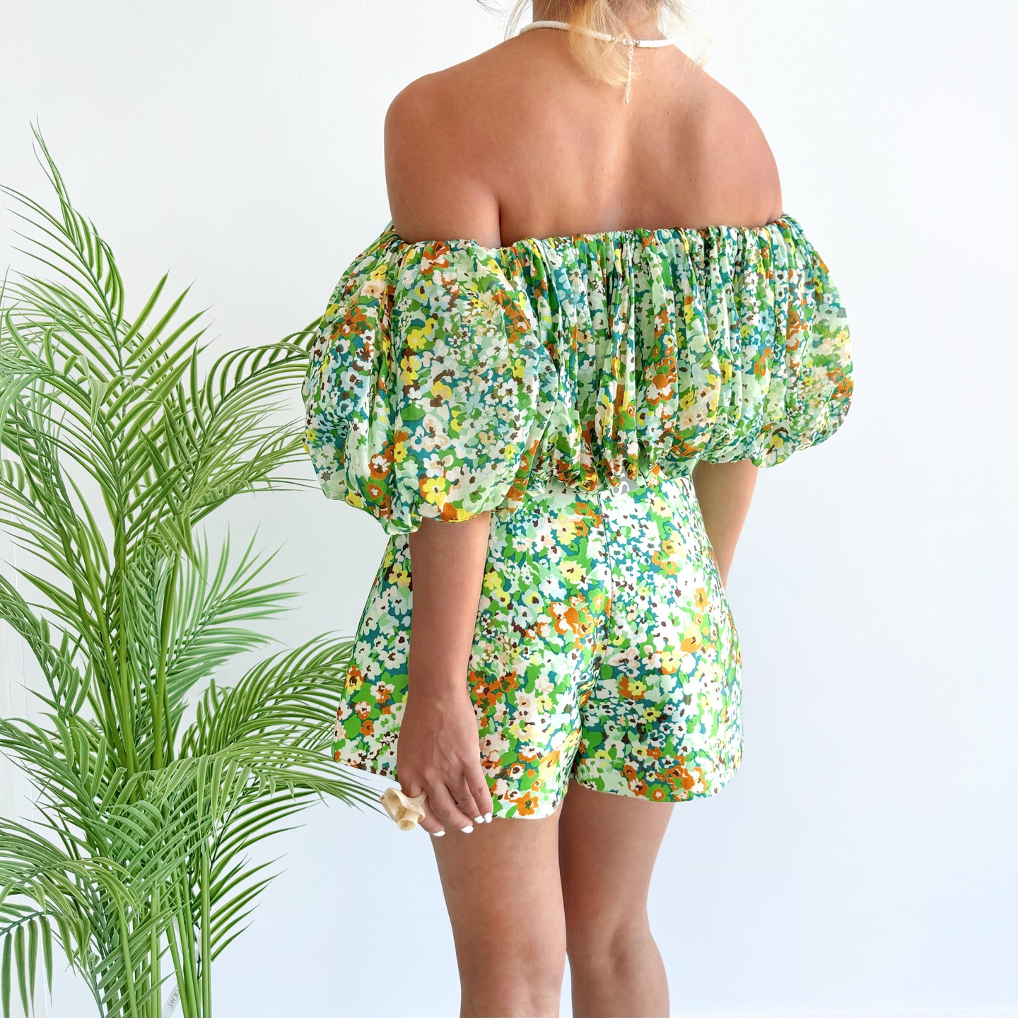 A vibrant floral romper featuring a dramatic puff sleeve design.
