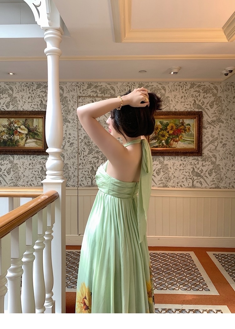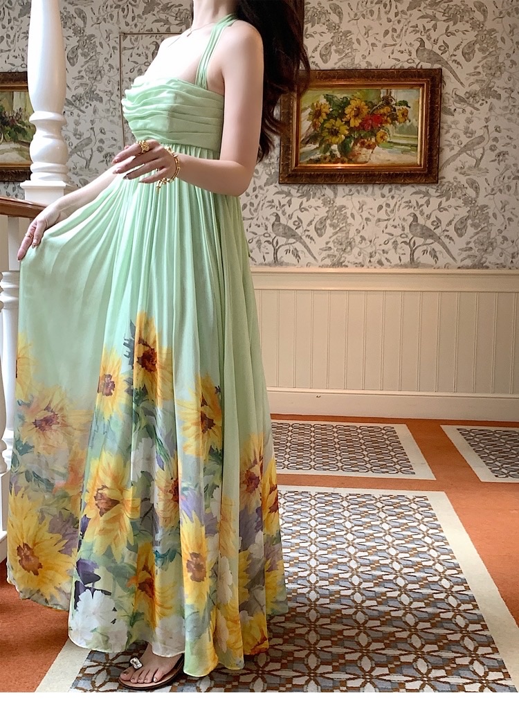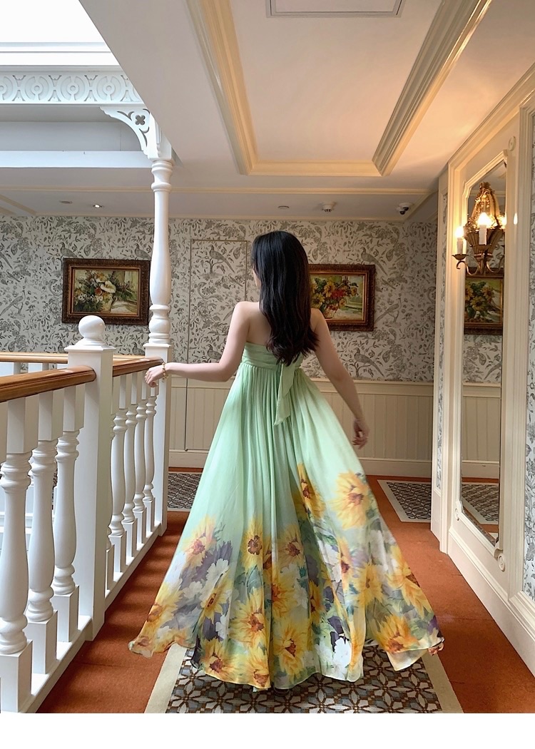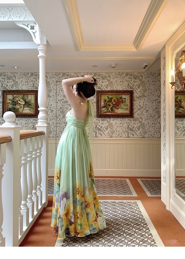 A flowing, floral-printed gown perfect for elegant occasions.