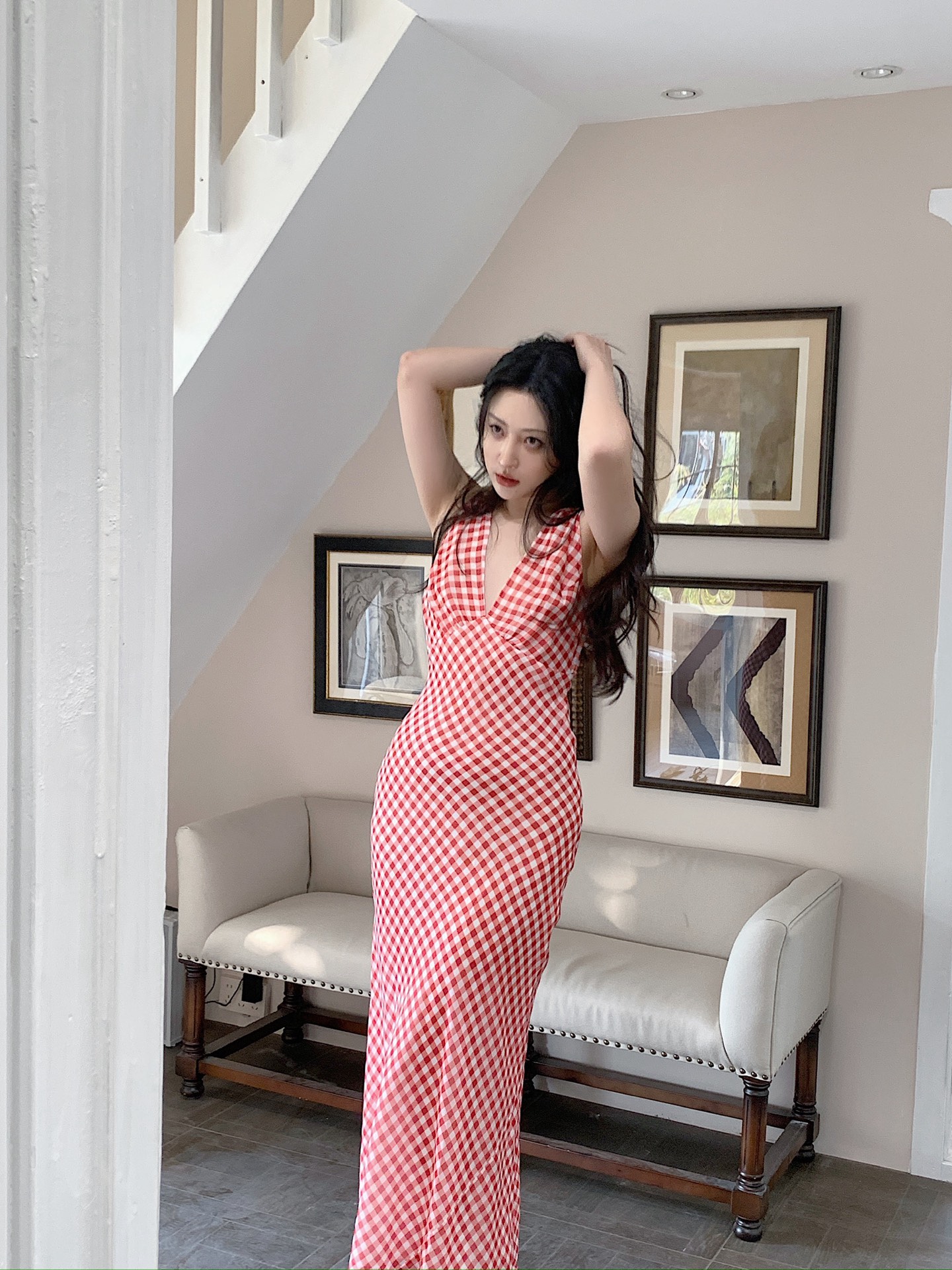 Red and white gingham echoes the lingering charm of a South French holiday,The deep V drape exudes relaxed yet powerful elegance.Sunlight flows like l