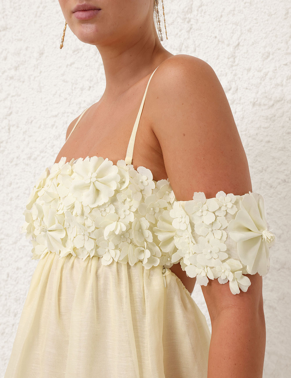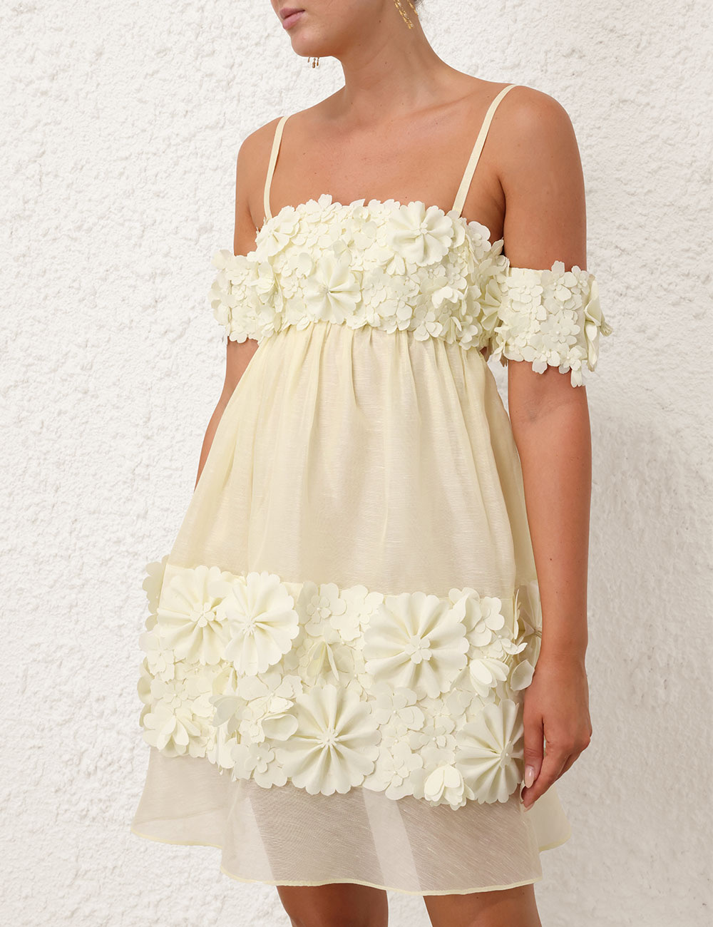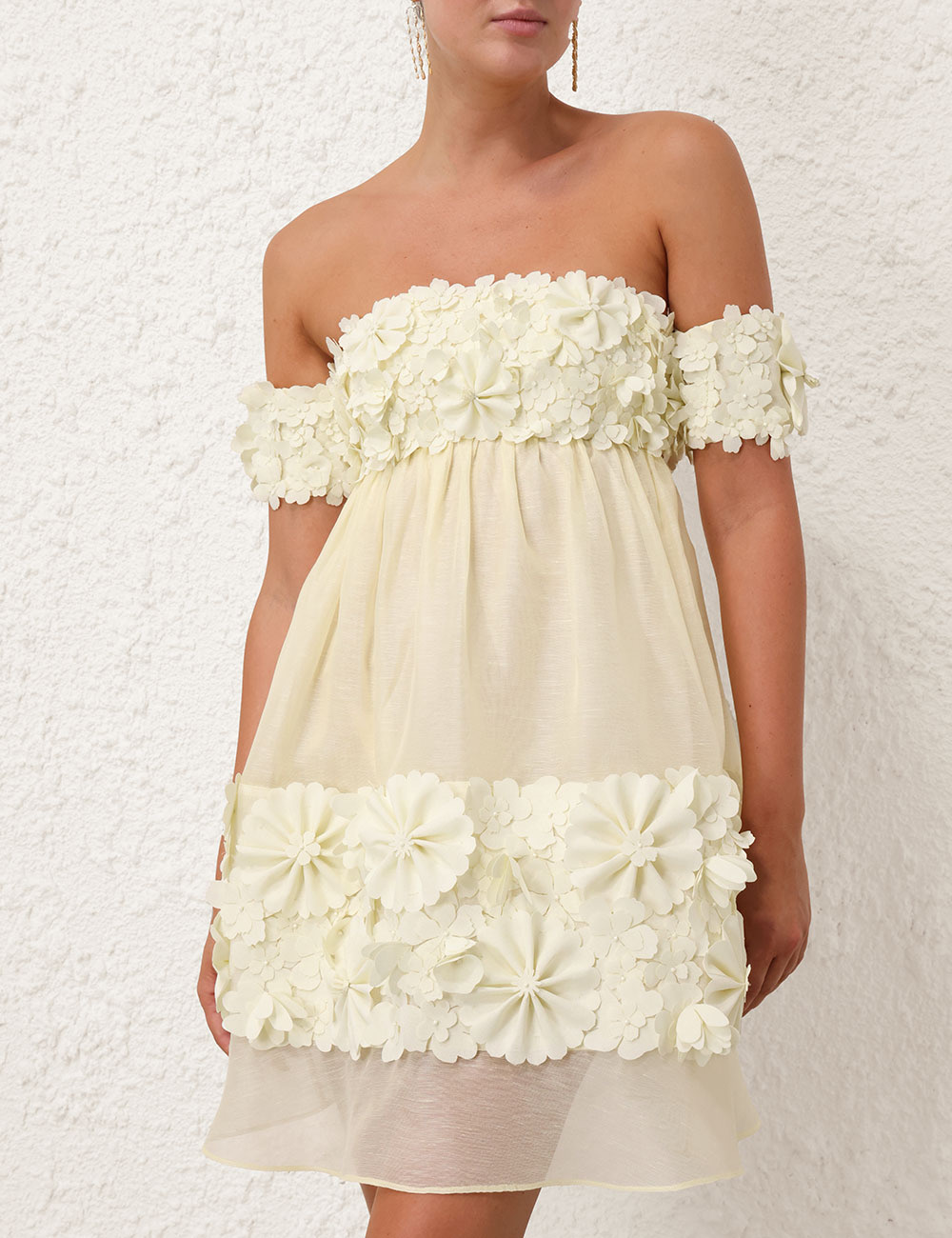 Zimmerman Made of luxe linen and silk, The whimsical Harmony minidress decorates the off-the-shoulder bodice with numerous floral appliqu