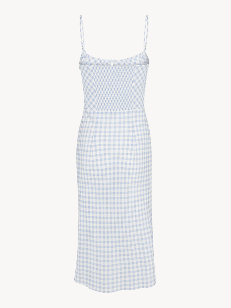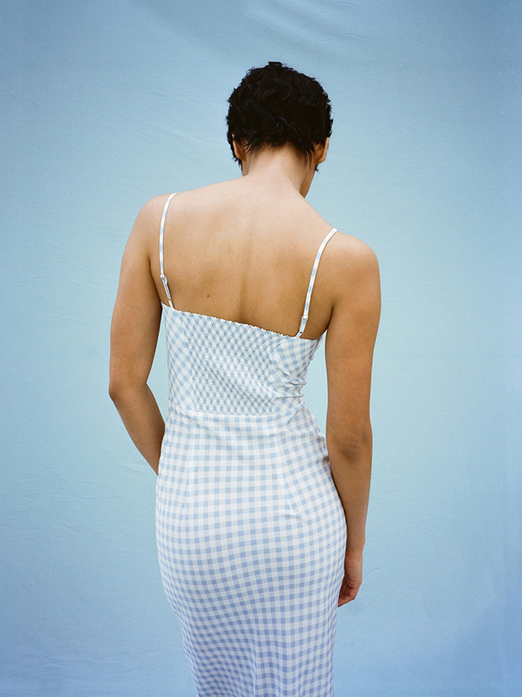 The perfect starting point for a summer dress... classic plaid texture, fresh color feminine medium-length cut, slightly exposed milk maid style chest