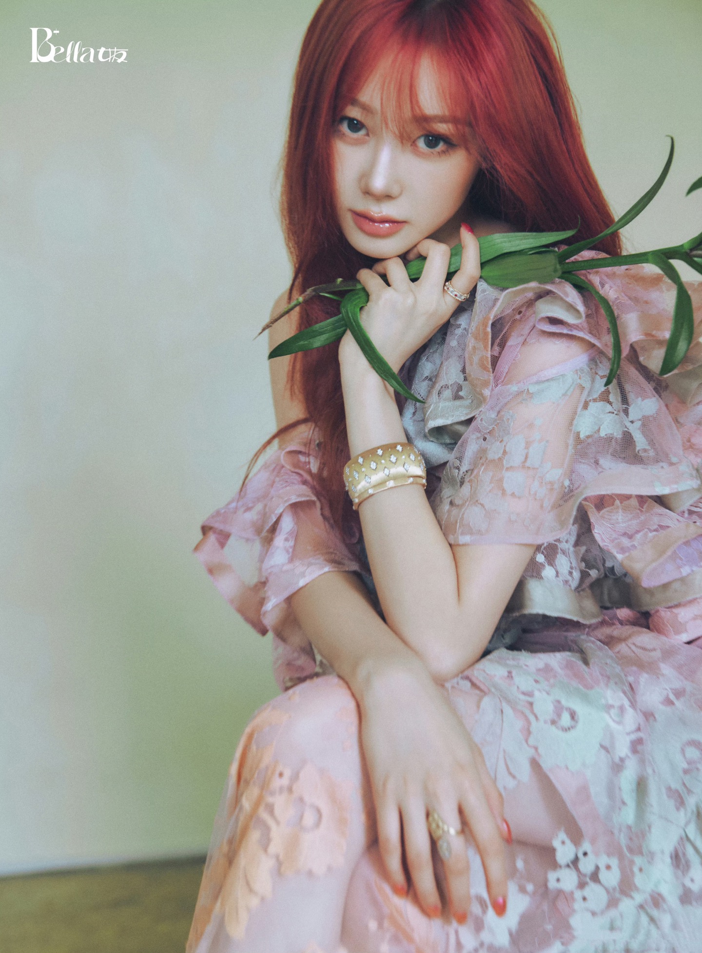 Weaving the pink-purple hues and warm orange of spring into the texture of lace. Layered ruffles bloom like petals, and floral patterns emerge faintly