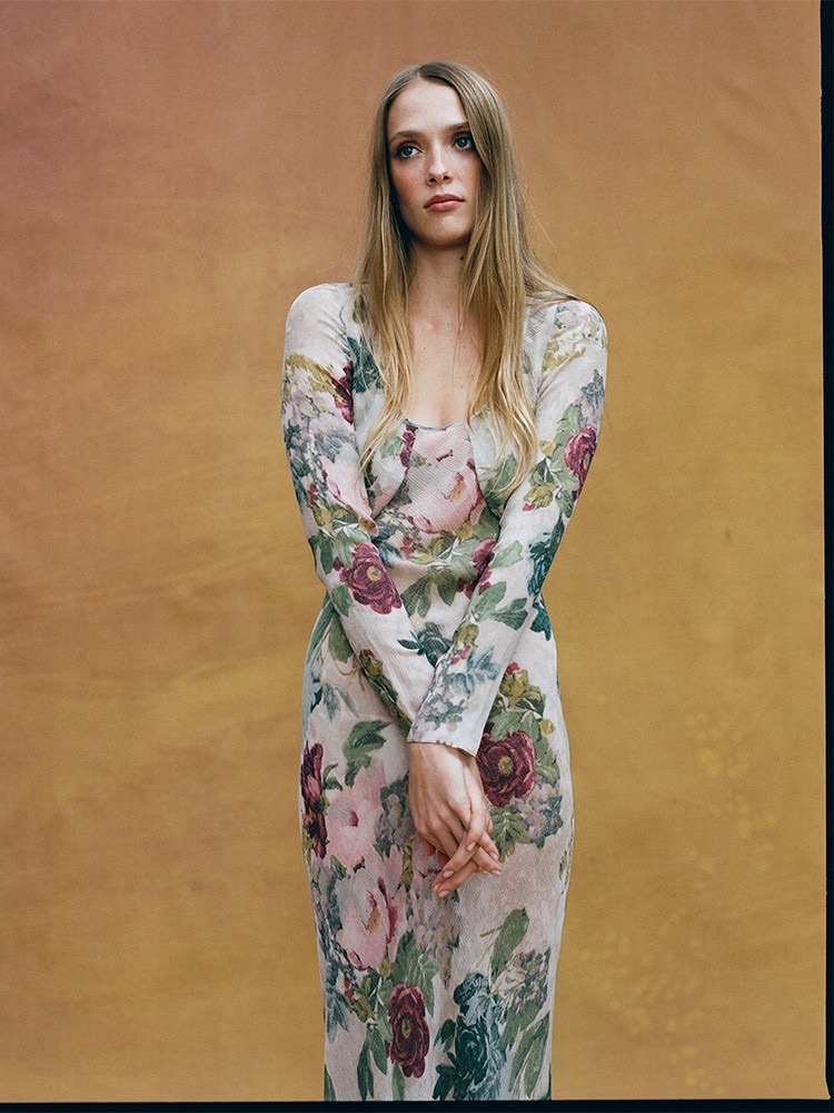 Zimmerman Weaving the pink-purple hues and warm orange of spring into the texture of lace. Layered ruffles bloom like petals, and floral patterns emerge faintly
