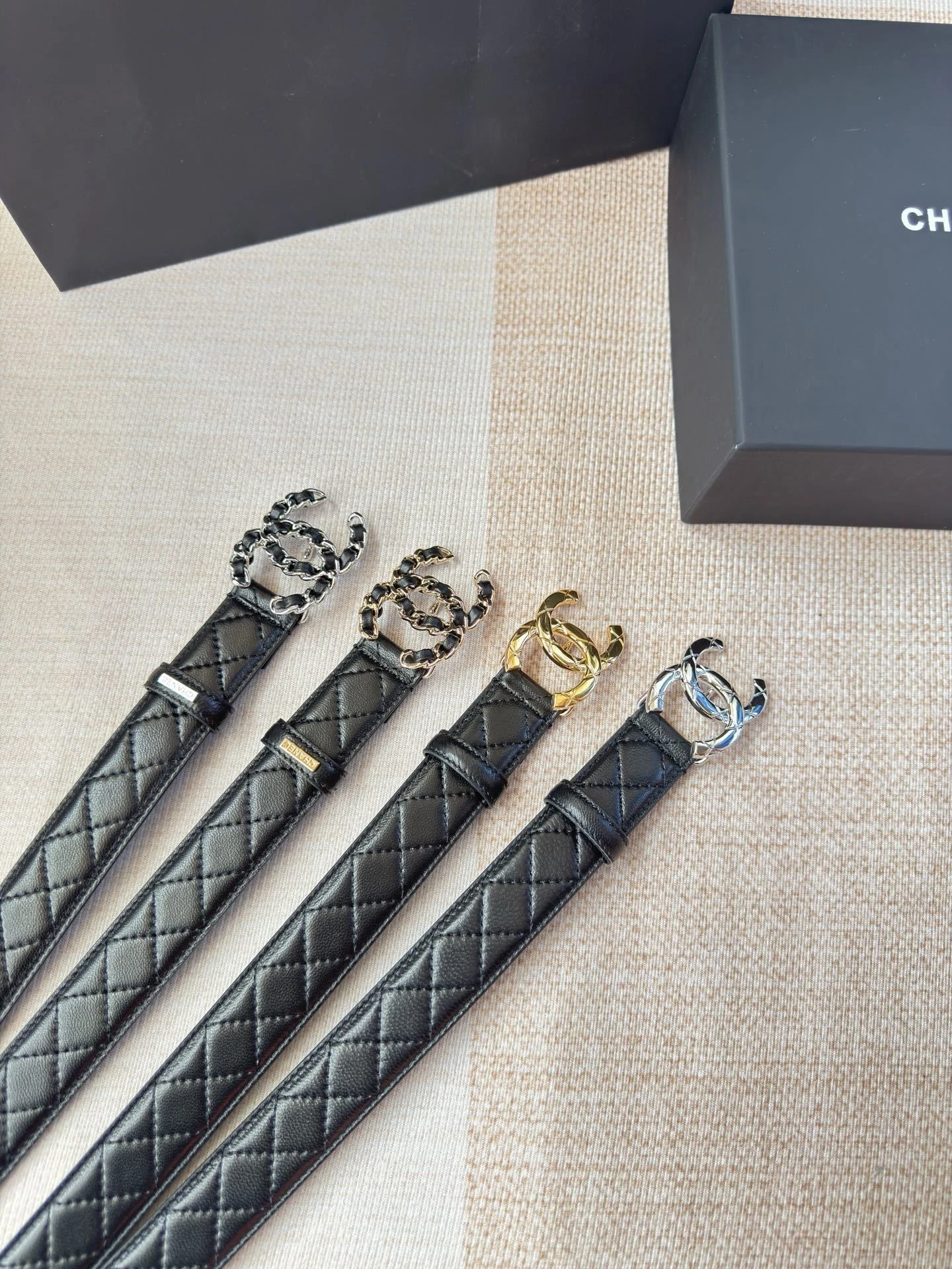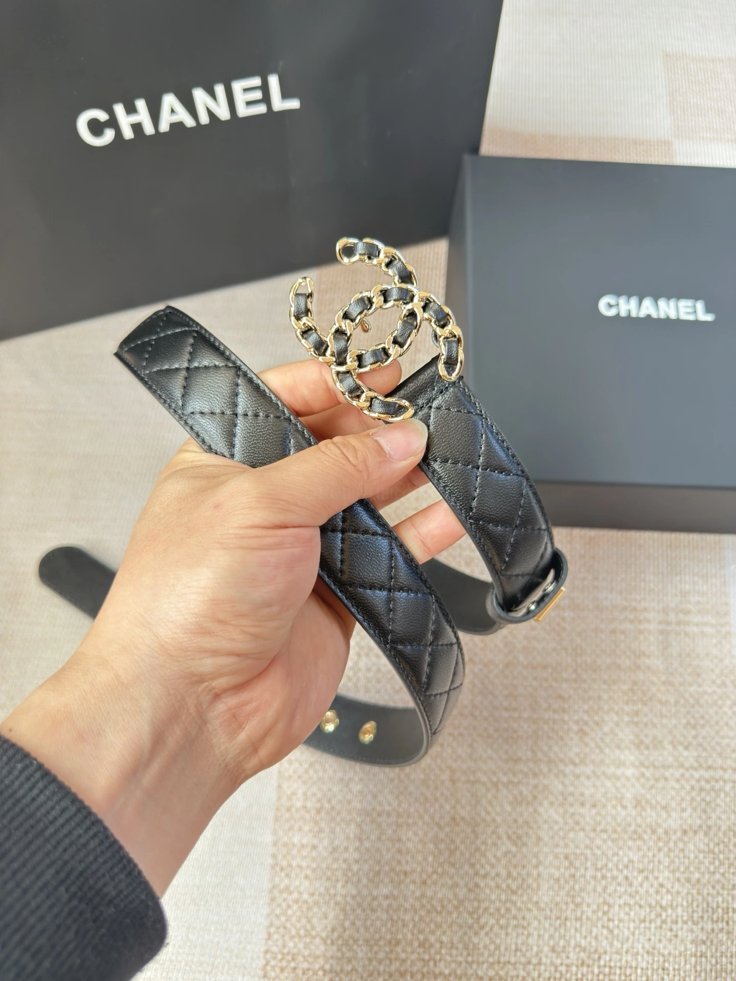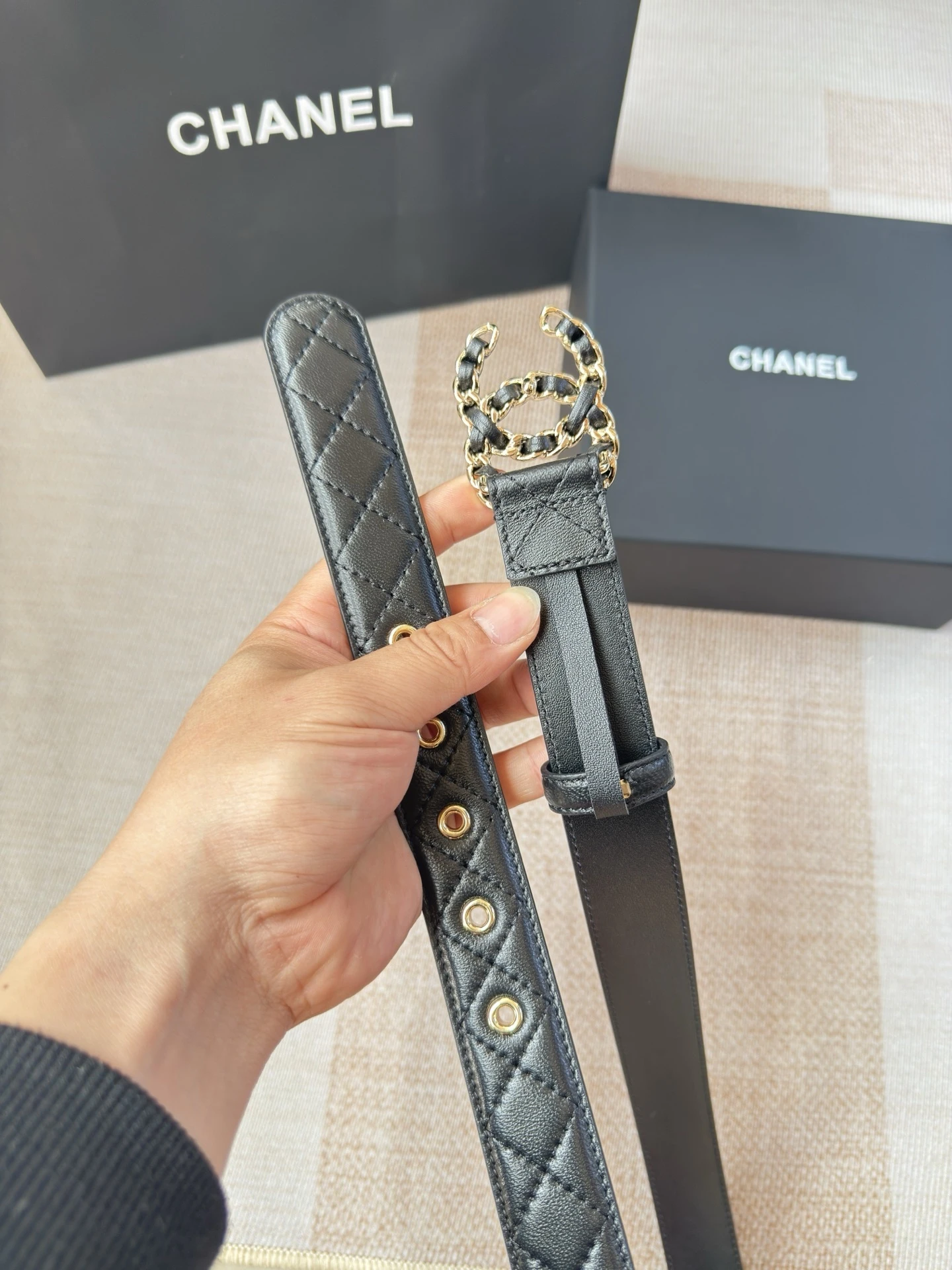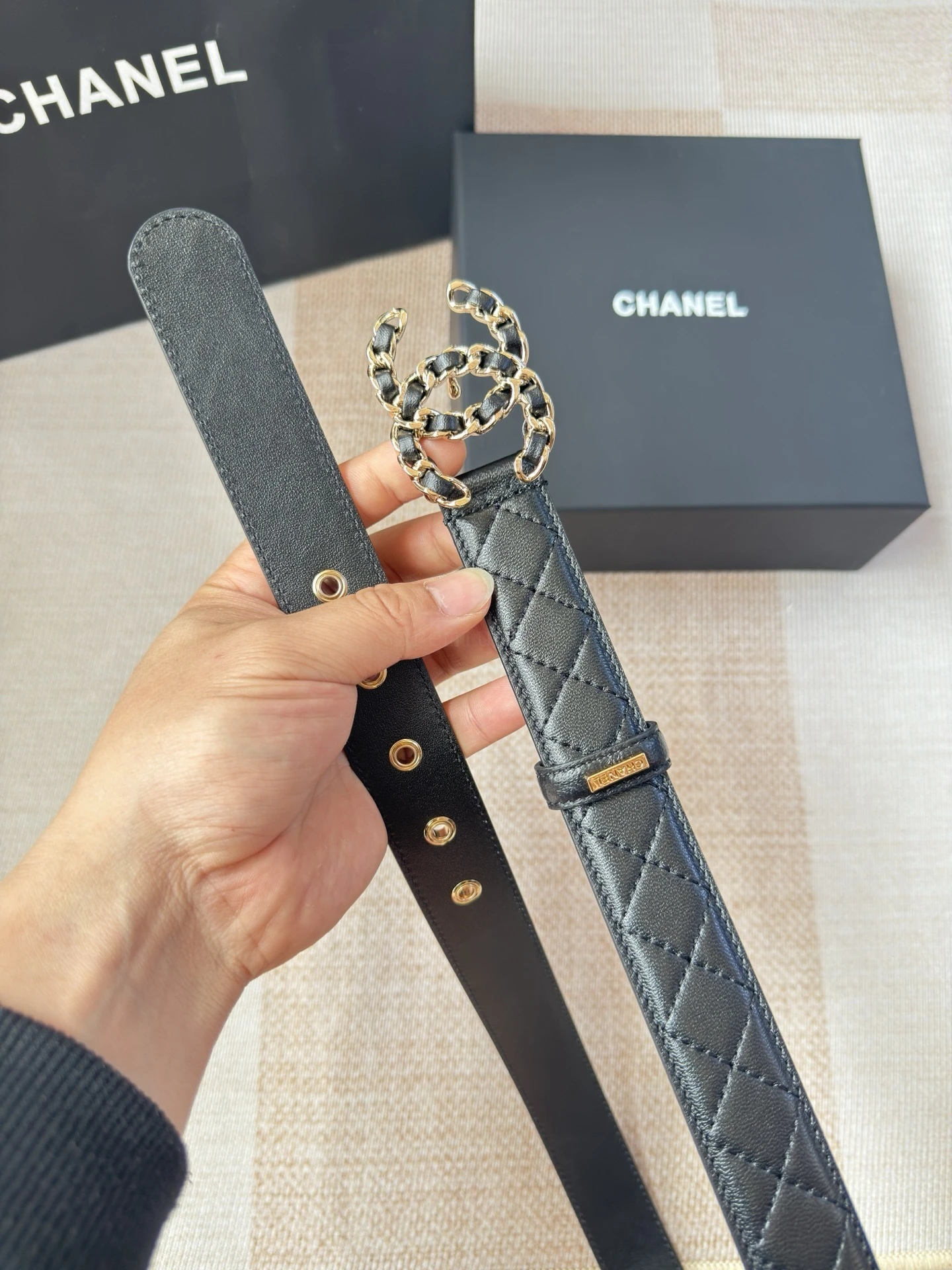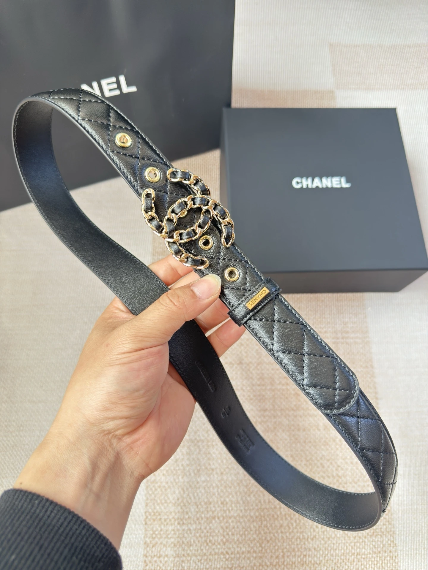 Chanel's new ladies belt The classic metal double C logo. Made of diamond-patterned sheepskin. The texture of the sheepskin is extremely soft. The hardware fasteners are of exce