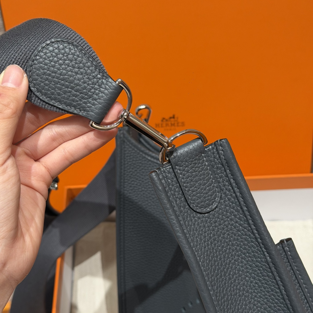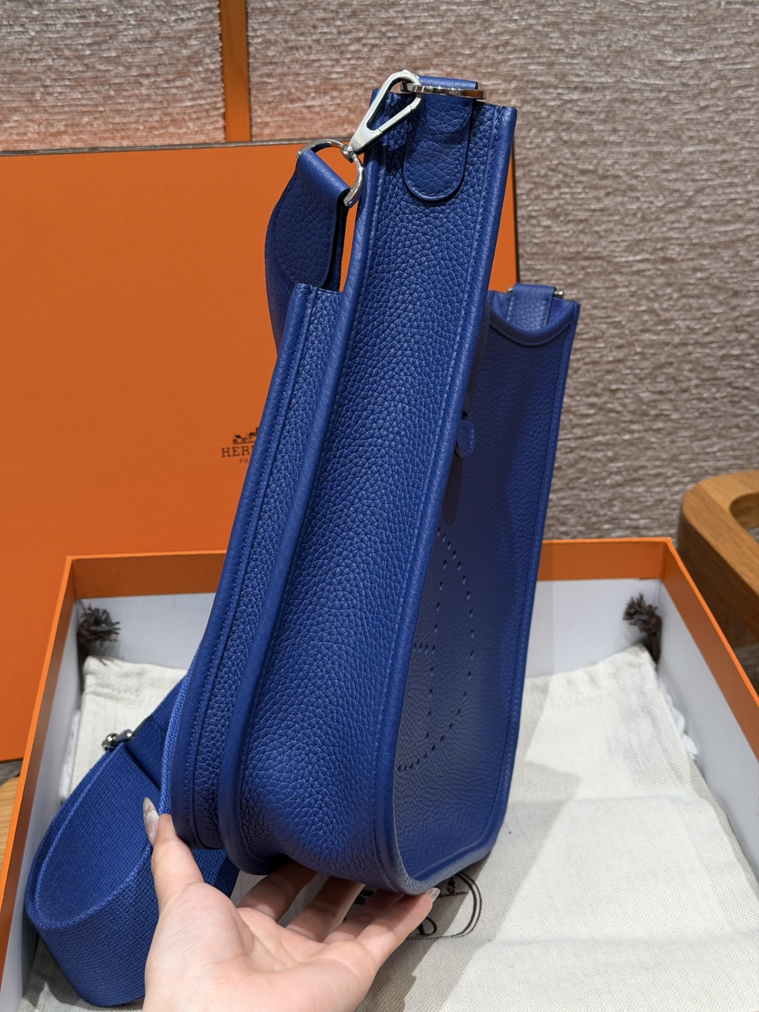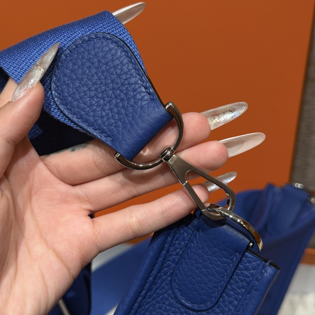 Hermès Evelyne — культовая сумка через плечо с перфорированной H. Цвет: 7T / Blue Electric. Спортивный шик и узнаваемый дизайн.