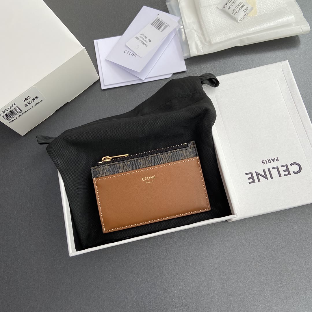 【特级纯钢五金原厂皮】TRIOMPHE标志印花羊皮拉链卡包/2024小赛 拉链锁闭 1个角撑隔层 1个扁平口袋 3个卡糟 编号:10F992BZ.9.04LU 992黃褐/老花
