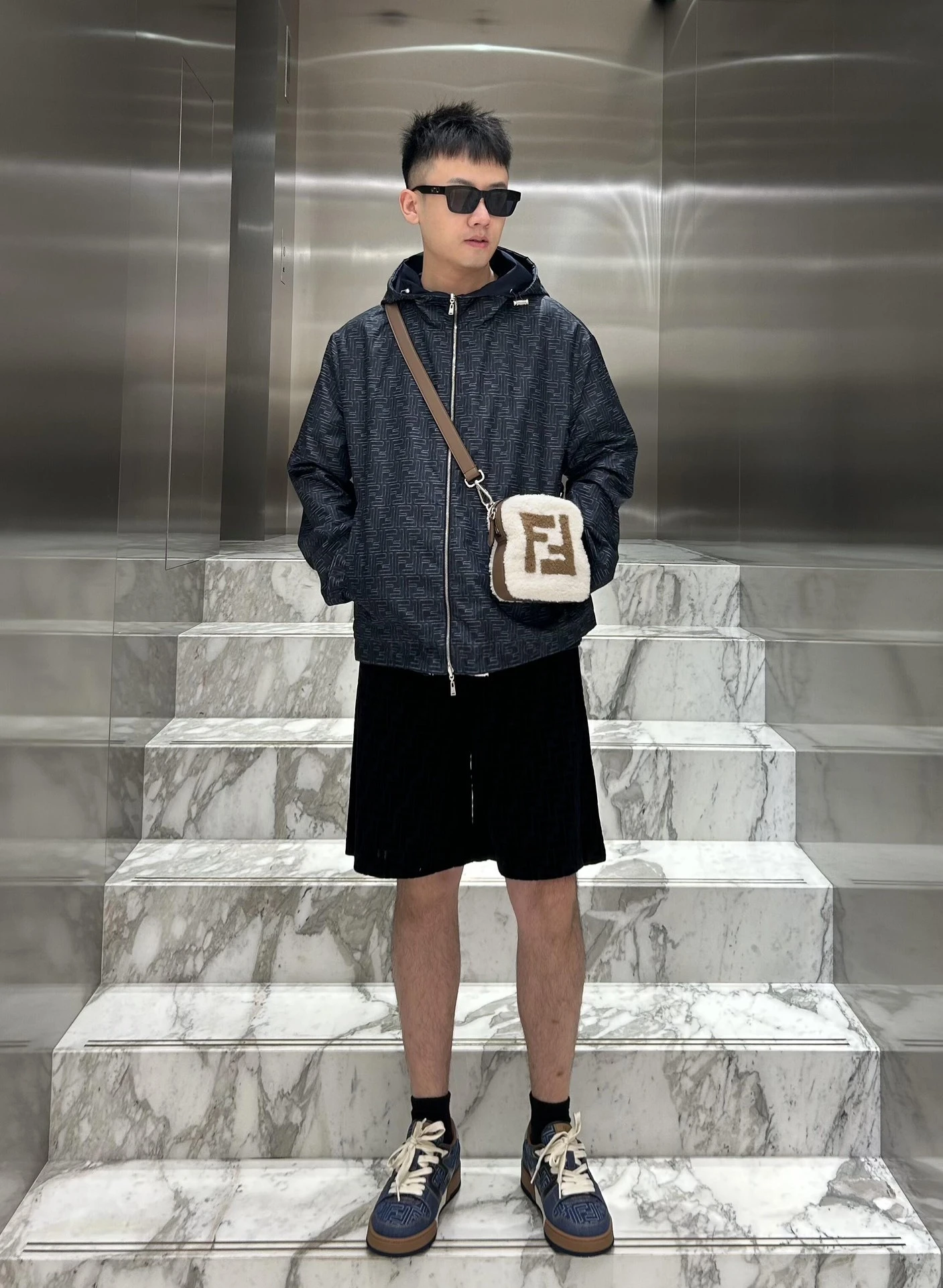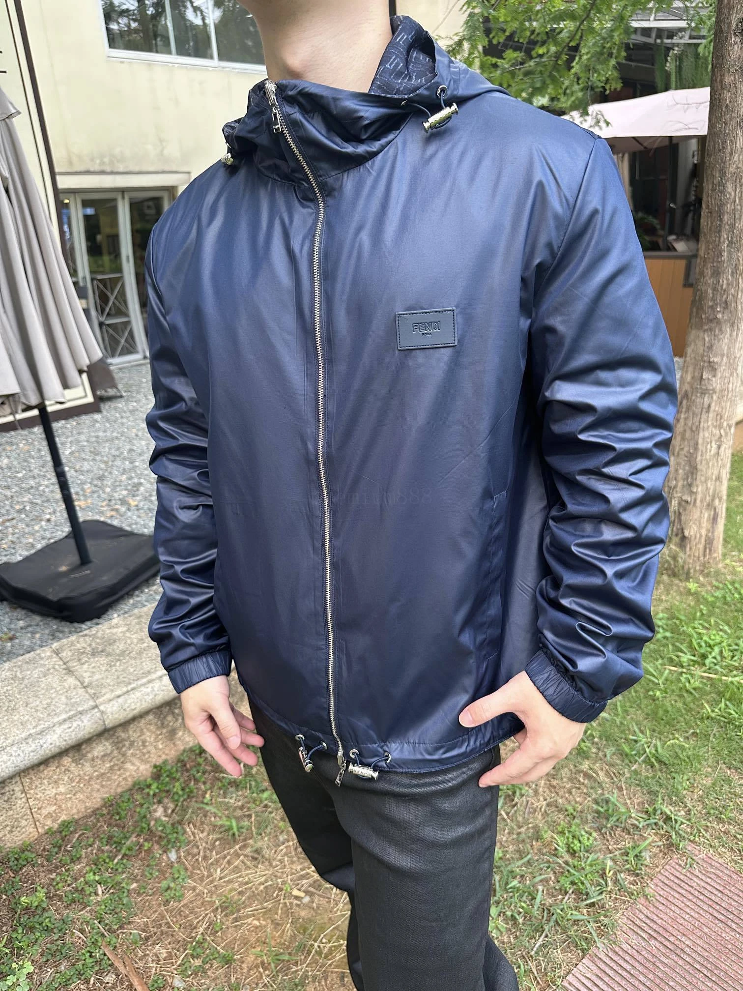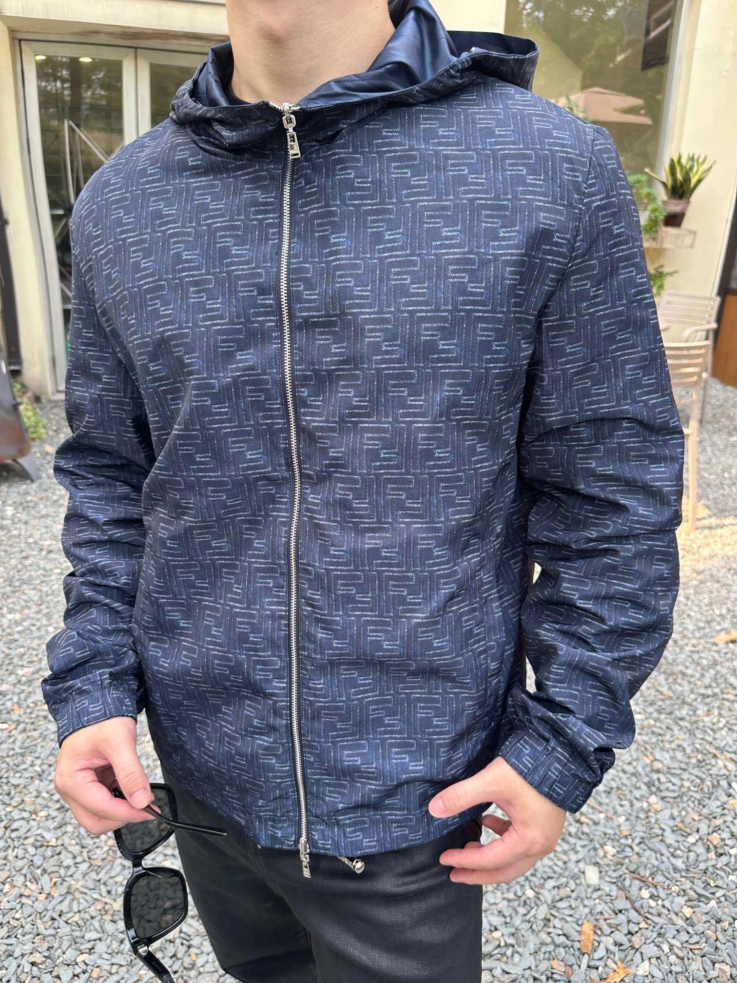 Fendi FF reversible hooded jacket Customized smart shaping nylon trench fabric Excellent texture Comfortable and close to the skin with deep navy blue as the background color One dress and two realms Double-sided charm One side is decorated with a full-width FF pattern Paved like the code writing o