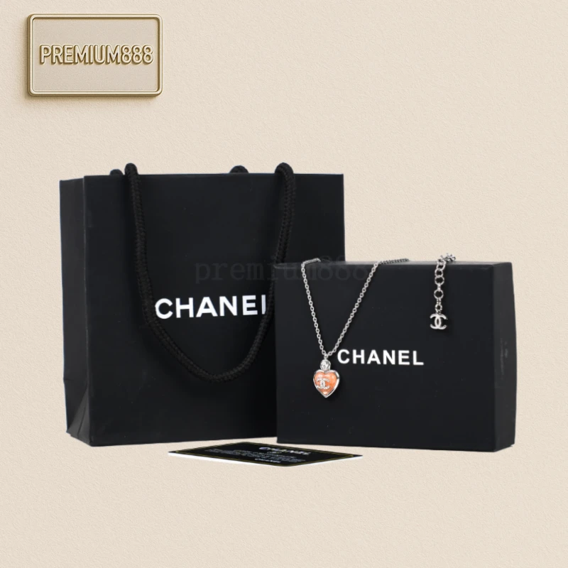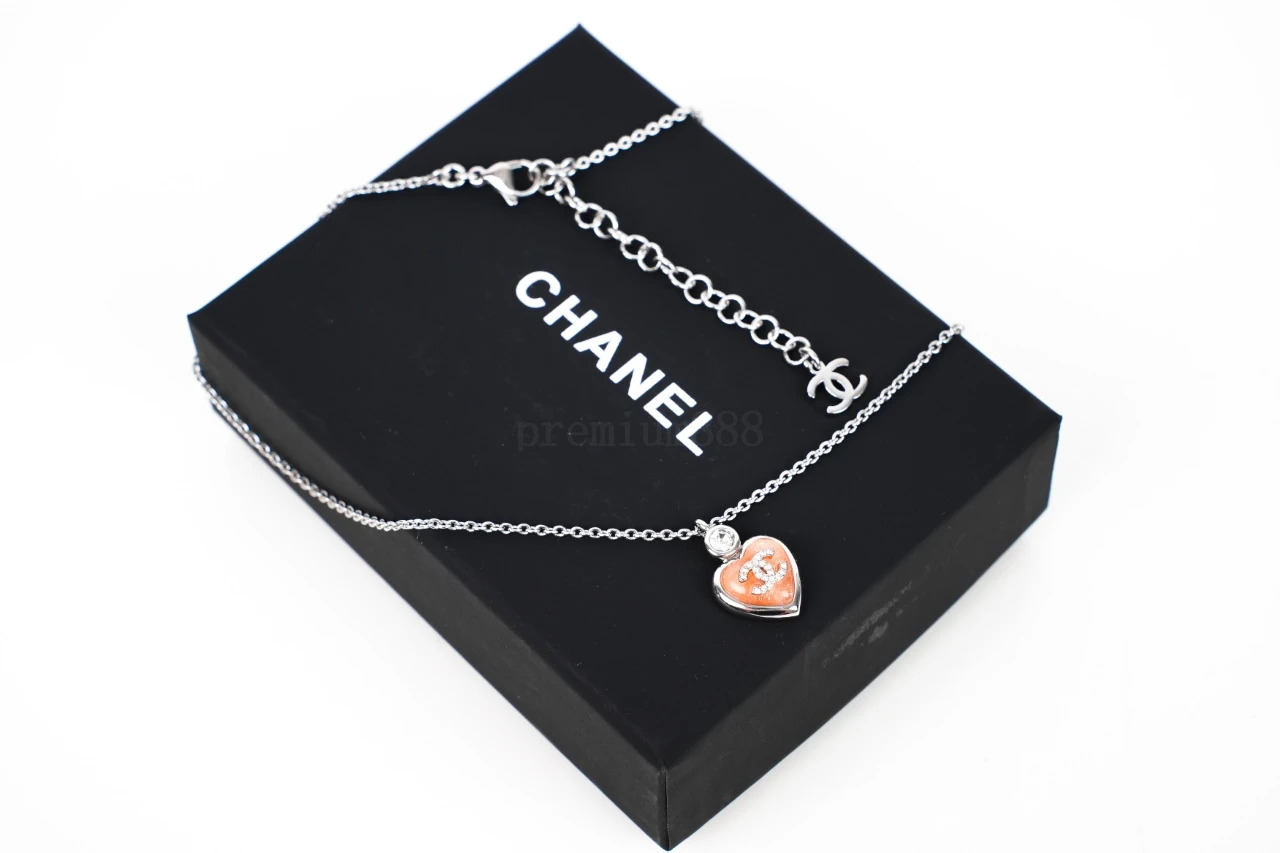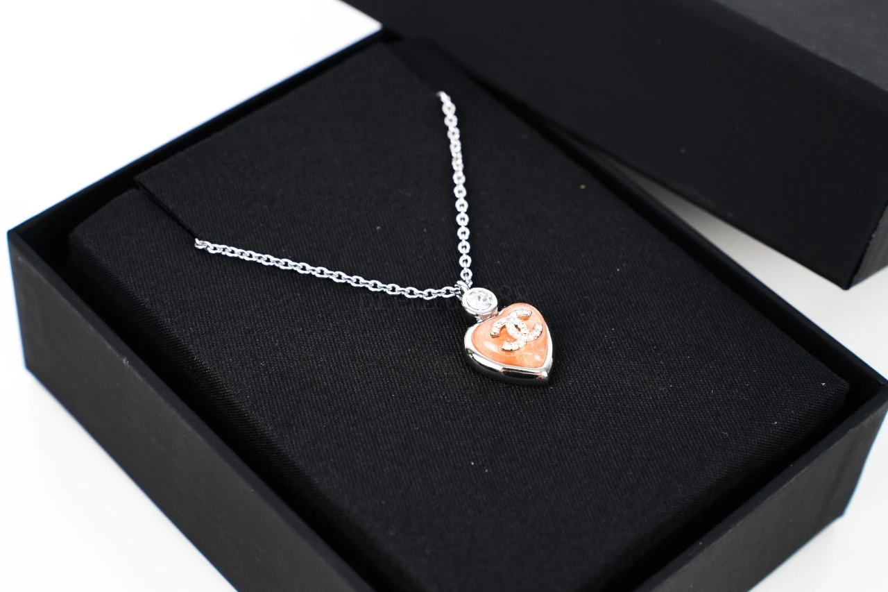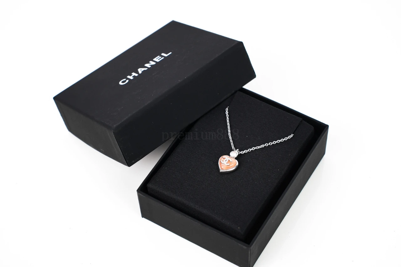 Chanel Heart Necklace Pink Material: imported resin glaze hand-inlaid with high-carbon diamonds Pure copper chain plated in 18K white gold Tedious jewelry making process: Exclusive mold opening - laser engraving - grinding - Plating - diamond setting - inspection - packaging