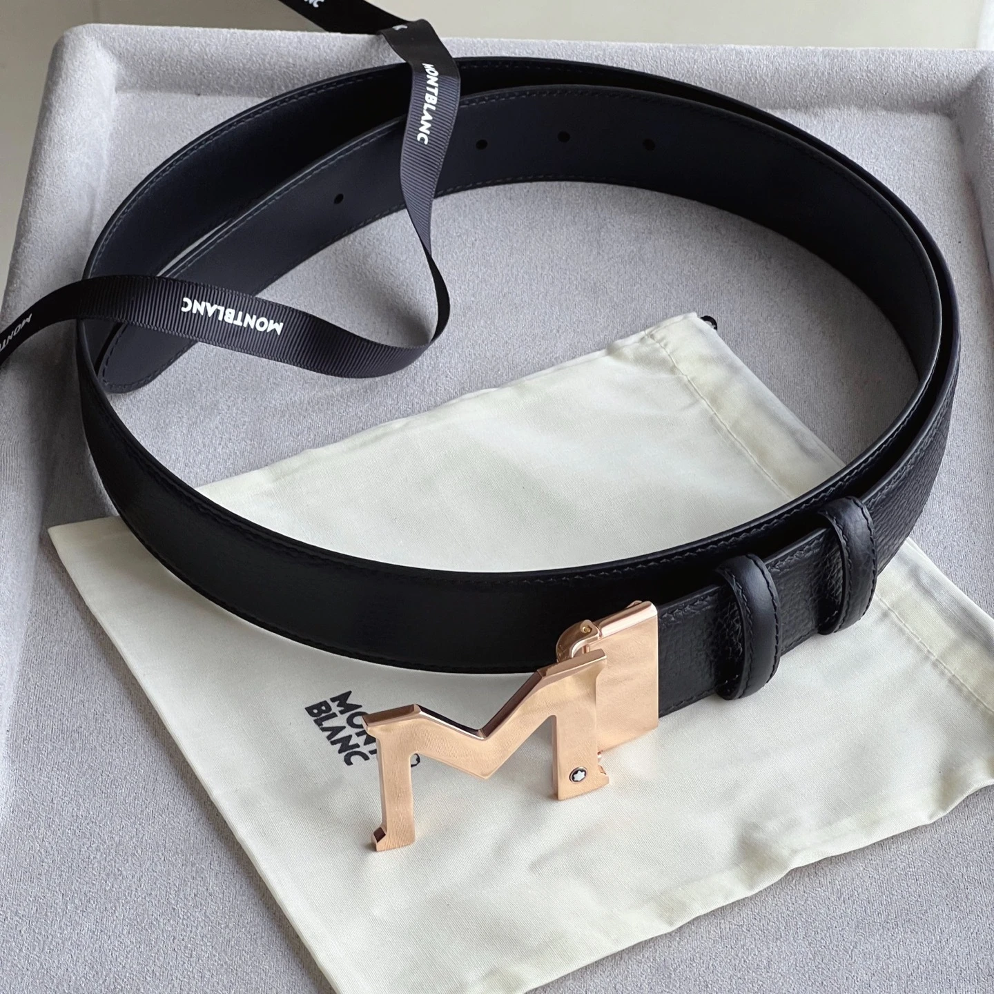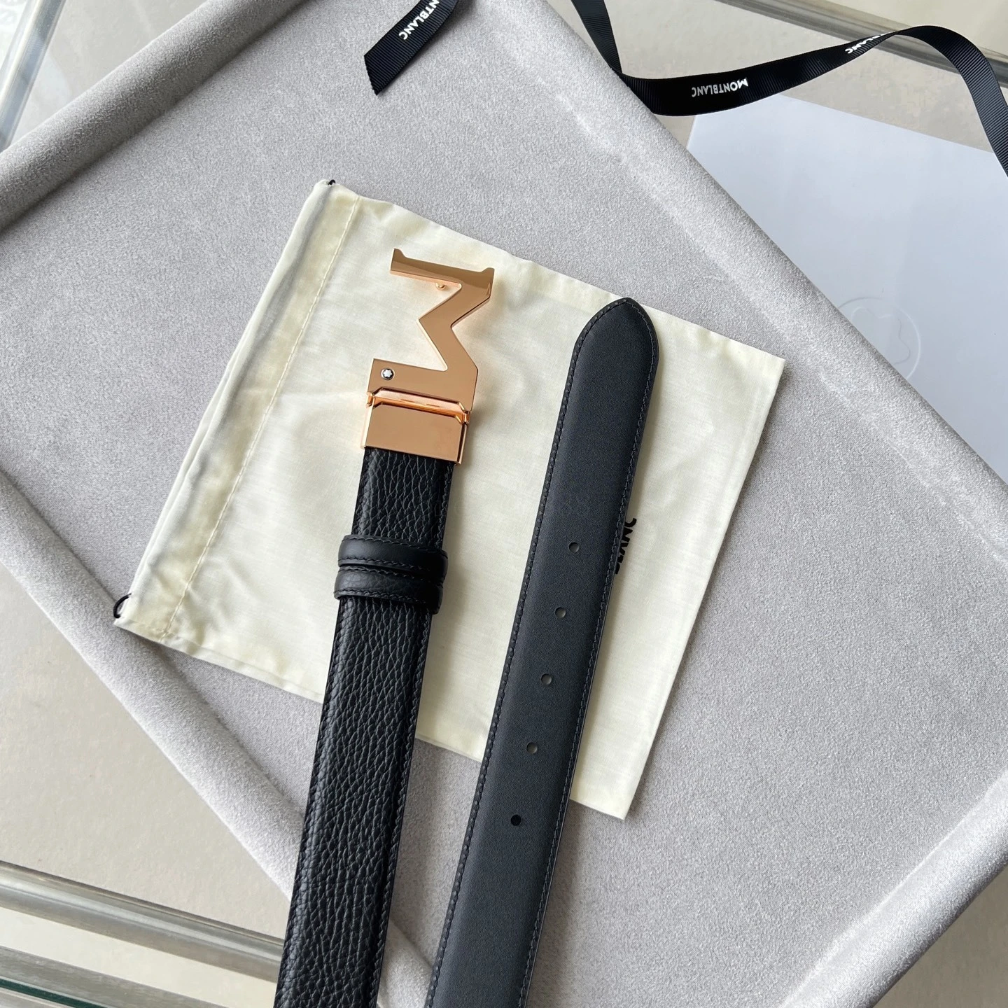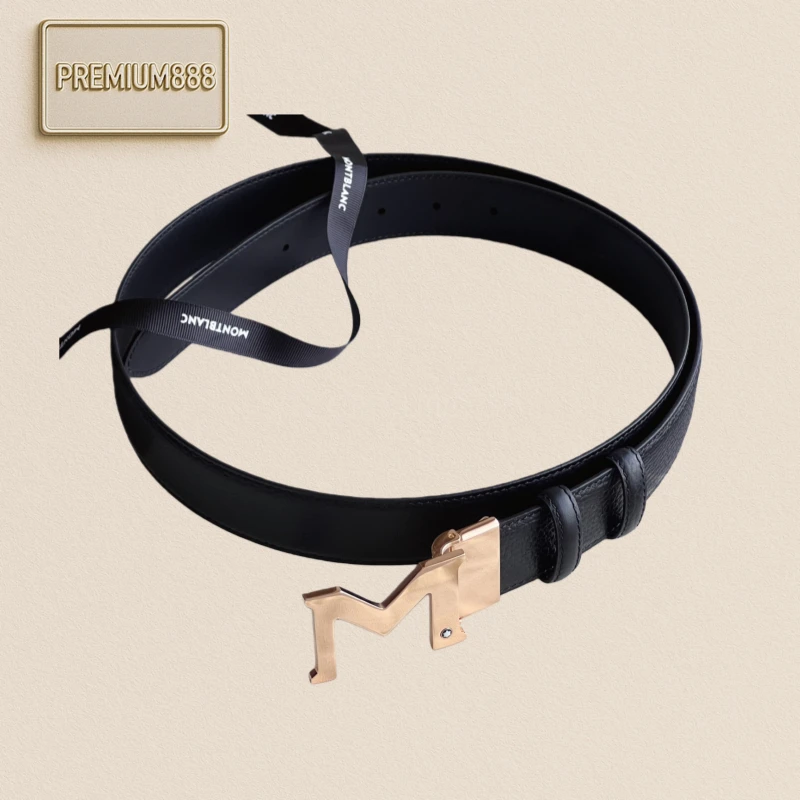 " M " shape metal buckle black double-sided leather belt (35mm) Plated palladium " M " pattern buckle. Adjustable length, 3.5 cm x 120 cm. Double-sided red grain and black smoot