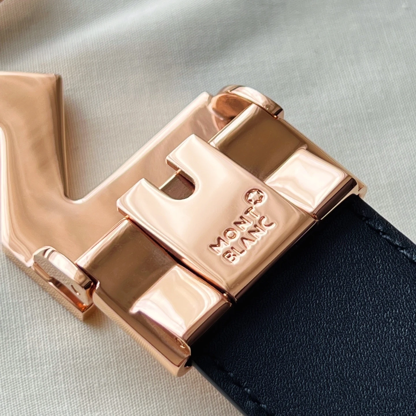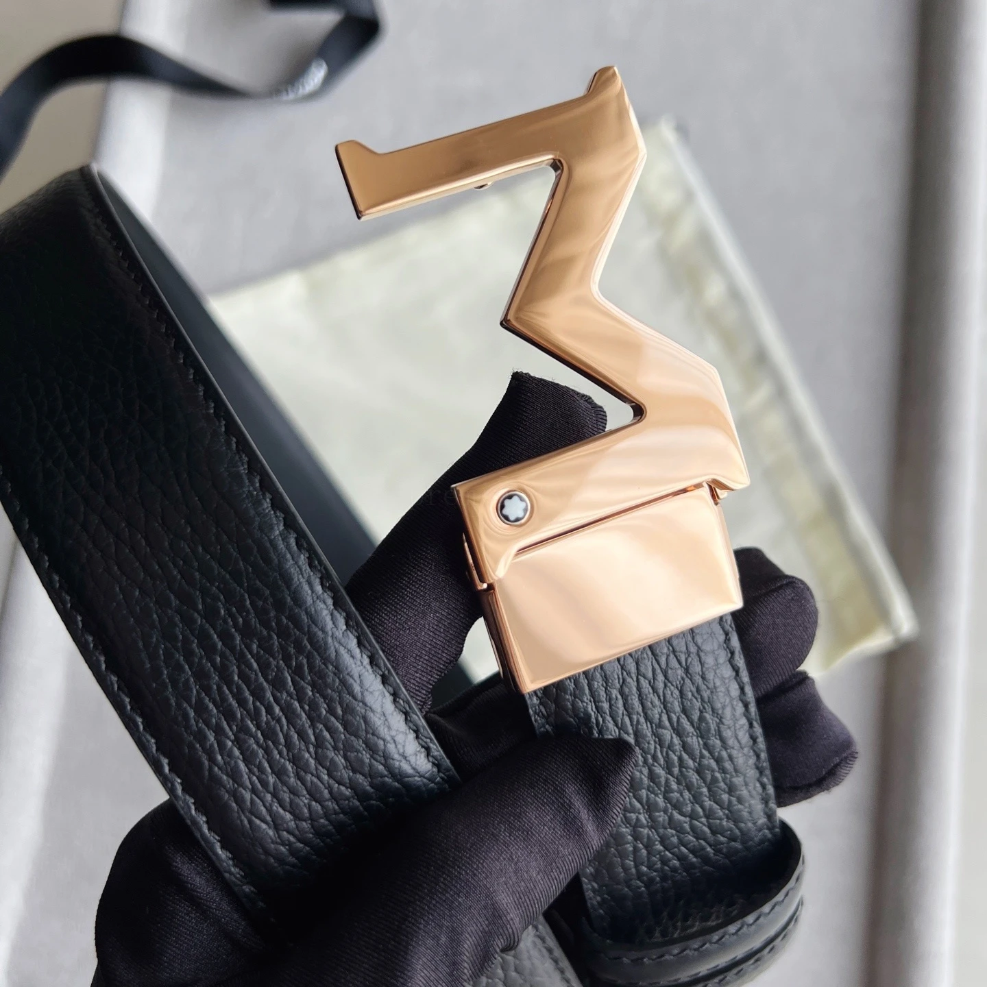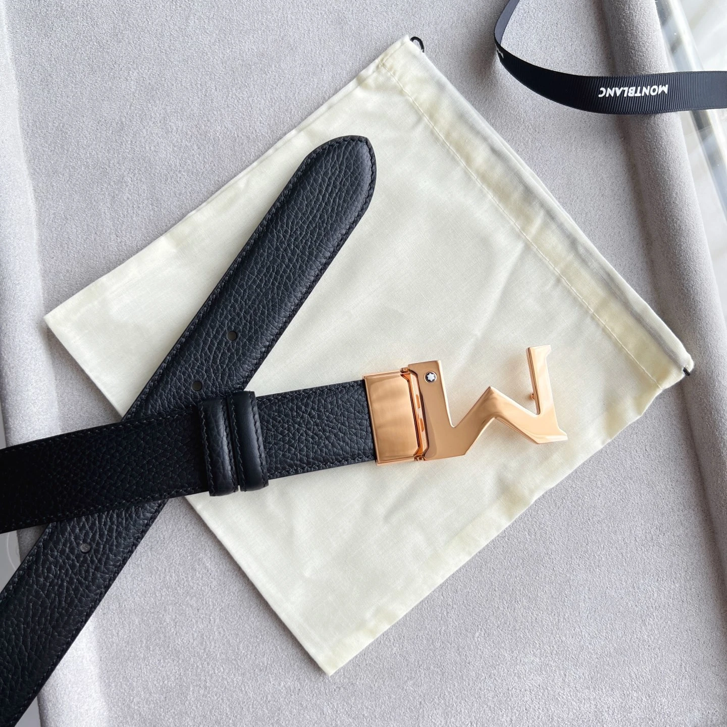 " M " shape metal buckle black double-sided leather belt (35mm) Plated palladium " M " pattern buckle. Adjustable length, 3.5 cm x 120 cm. Double-sided red grain and black smoot