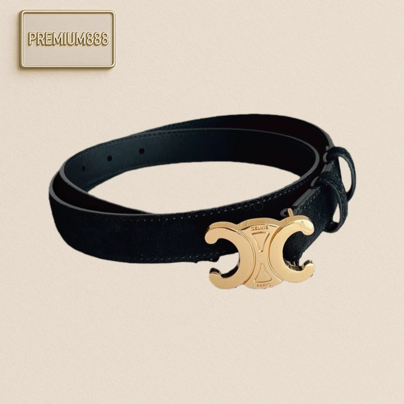 New arrivals from Celine's flagship store - women's belts made of top layer suede leather. Perfect for winter outfits. Width: 2.5cm. Comes with unique Arc de Triomphe metal fast