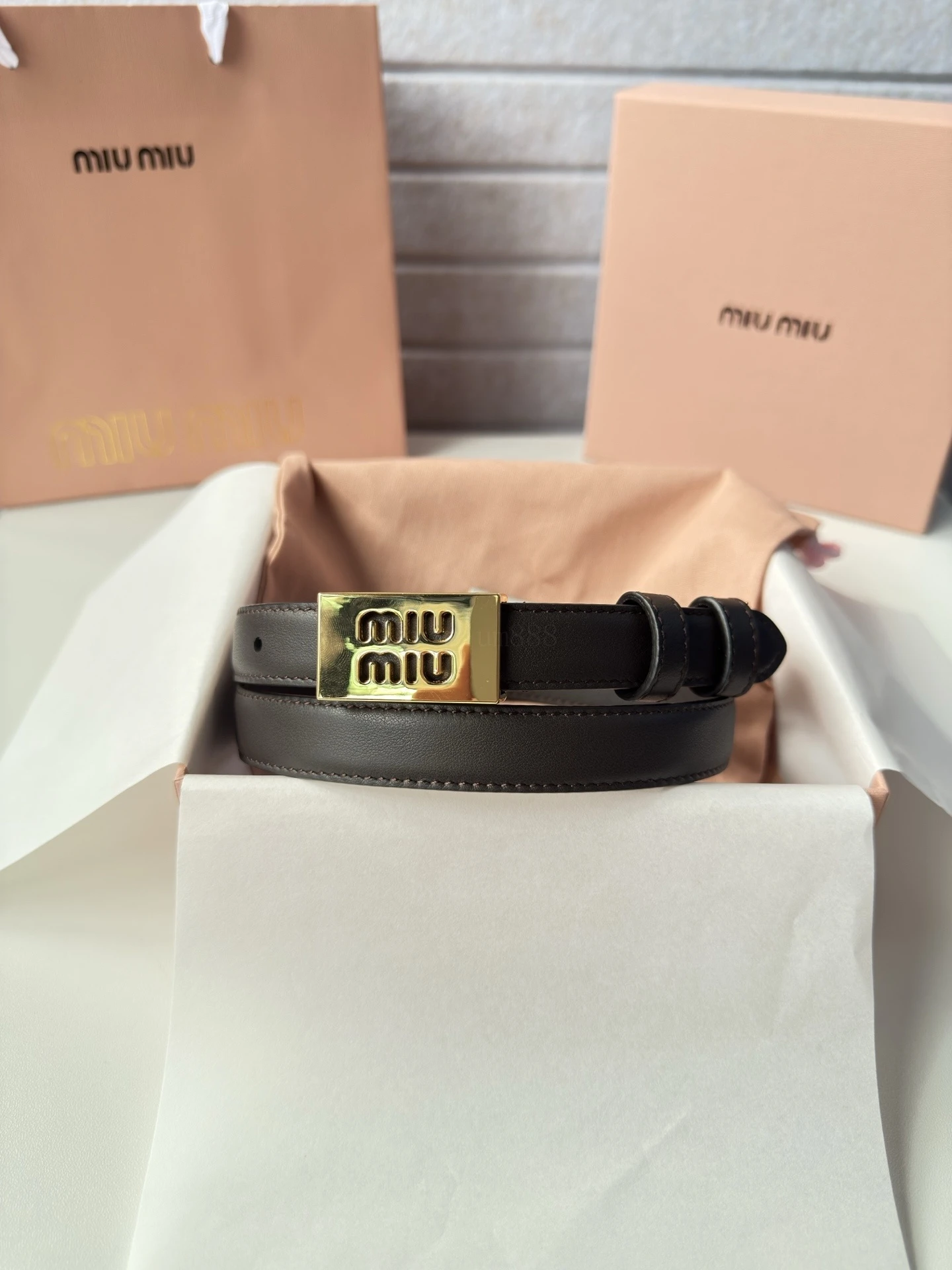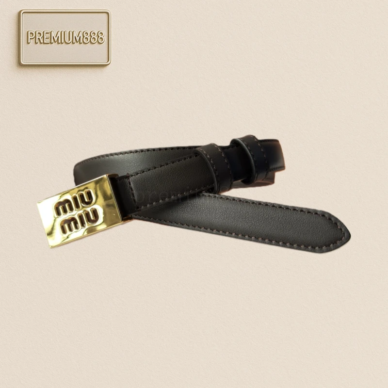 Miumiu 24ss new belt with Miumiu English small golden buckle. This belt is an ideal choice for enhancing the elegant style of your outfit. The eye-catching distinctive micro-log