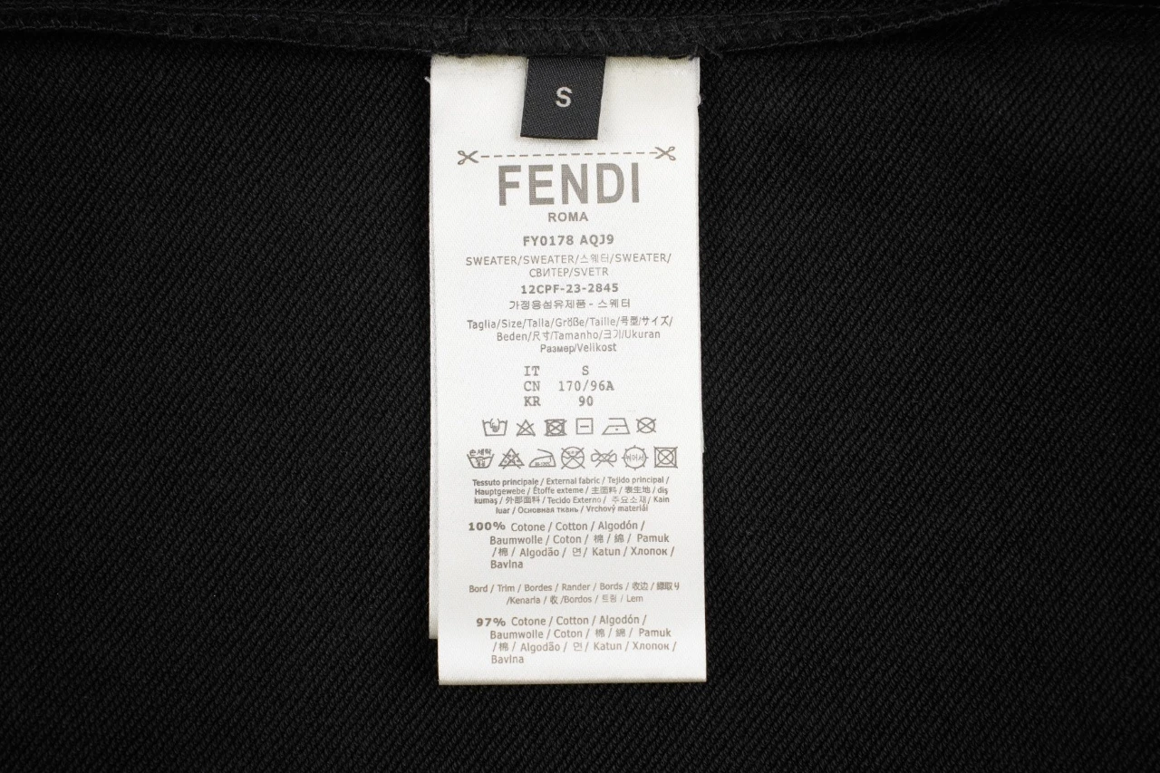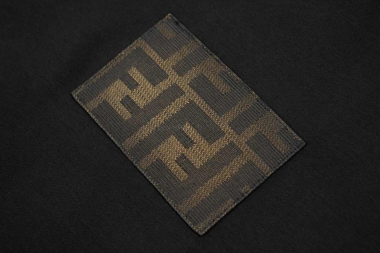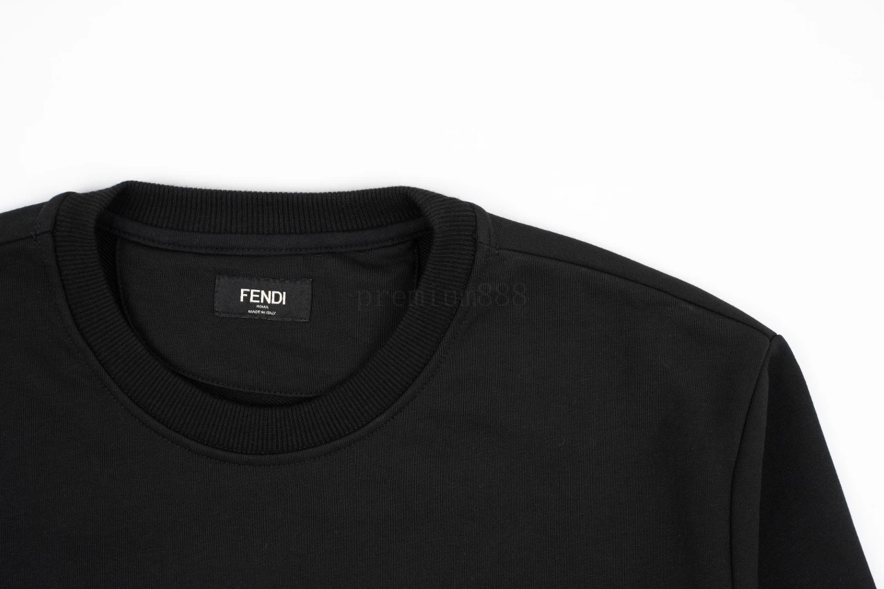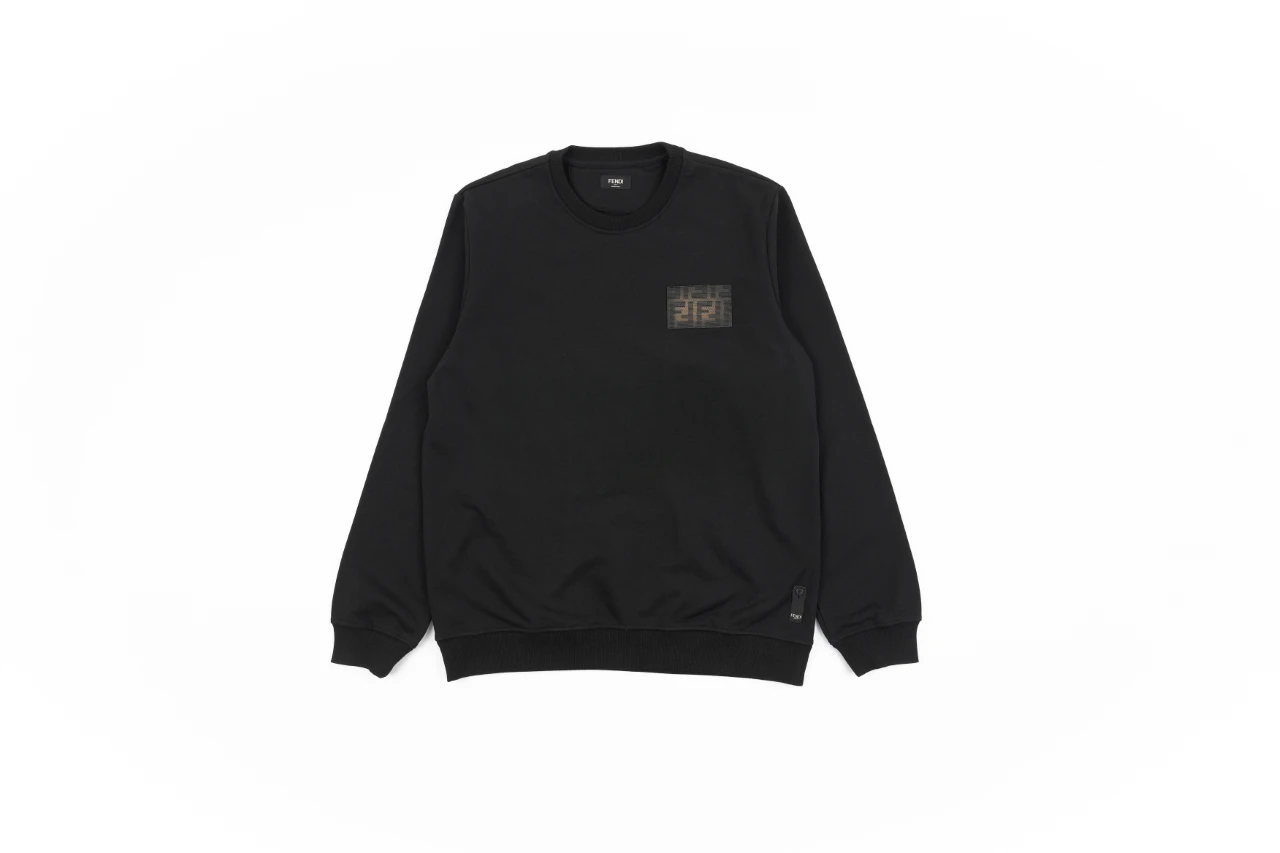 Fendi chest badge crew neck sweatshirt Fabric: 32 cotton terry sweatshirts, 340 grams, 100% combed cotton Ribbing: 26 racks 2×2 ribbed, weight 500 grams, 100% combed cotton Process: Exclusive custom weaving and dyeing 32 combed cotton fabrics, dyeing and repairing 5 times, fabric development time o